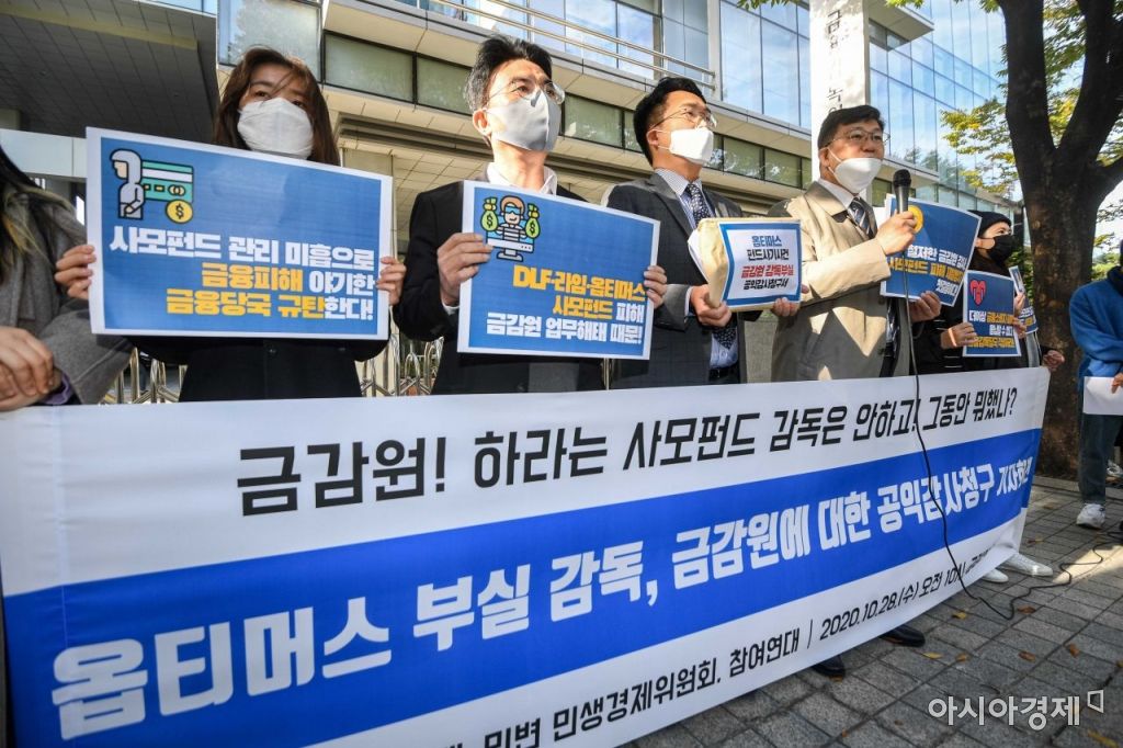 서울 여의도 금융감독원 앞에서 참여연대 소속 관계자들이 옵티머스 펀드 사기 사건과 관련해 금감원 감독 부실에 대한 공익감사청구 기자회견을 하고 있다./강진형 기자aymsdream@
