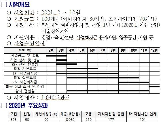 이 사업은 2010년부터 11년간 약 2000여개의 창업기업들을 지원해 그동안 누적 매출 약 6800억원과 5200명의 고용 창출 효과를 거두는 등 부산의 대표적인 창업지원 프로젝트이다.