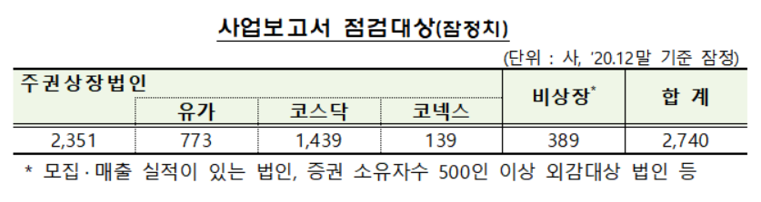 금감원은 21일 이런 내용을 다음 '2020년 사업보고서 중점 점검사항 사전 예고'를 발표했다. 12월 결산 상장법인 등 사업보고서 제출대상 법인은 총 2740사다.