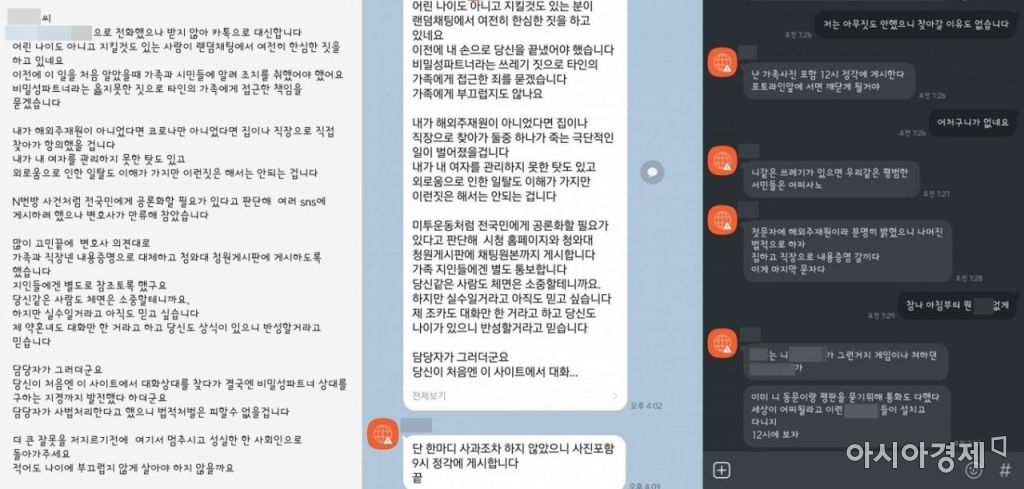 [아시아경제 송승윤 기자, 이정윤 기자 ]서울에 사는 직장인 A씨는 얼마 전 황당한 일을 겪었다. 갑자기 신원을 알 수 없는 누군가로부터 "랜덤채팅에서 여전히 한심한 짓을 하고 다니는 걸 알고 있다"는 내용의 카카오톡 메시지가 온 것. 상대방은 다짜고짜 "비밀 성 파트너라는 옳지 못한 짓으로 타인의 가족에게 접근한 책임을 묻겠다"며 "가족과 직장에 내용증명을 보내고 지인들에게도 (성범죄 사실을) 알리겠다"고 A씨를 협박했다.