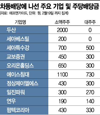 22일 금융정보업체 에프앤가이드에 따르면 12월 결산법인 기준 지난 19일까지 결산 배당 공시를 낸 상장사 중 차등배당에 나선 곳은 두산, 세아베스틸, 홀딩스, 교보증권 등 13곳이다. 차등배당은 대주주 호의로 소액주주에 대한 배당률을 상대적으로 높이거나 대주주에게 무배당을 결의하는 것을 의미한다. 중간배당과 자사주 소각과 함께 대표적인 주주환원책으로 꼽힌다.
