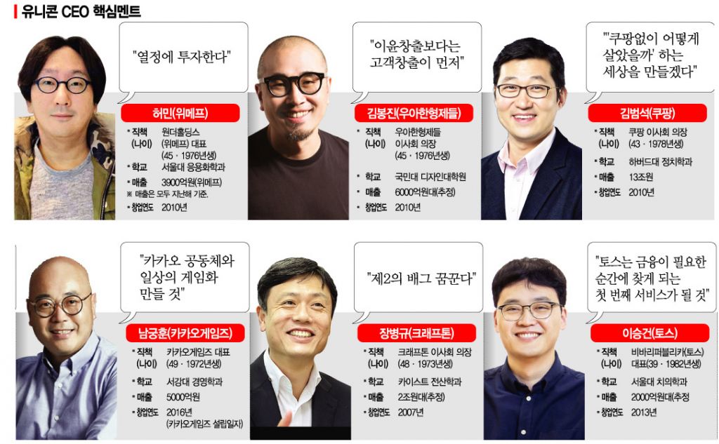 [아시아경제 김보경 기자, 부애리 기자] <i>스타트업이 1조원 이상의 가치를 지닌 유니콘 기업으로 성장하는 데에는 창업자의 역량과 리더십이 가장 큰 몫을 차지한다. 국내 유니콘 기업 주역들의 면면을 살펴보니 이들의 출신과 이력, 배경은 제각기 달랐다. 하지만 창의성을 무기로 혁신을 거듭하고, 때론 위험을 감수하는 과감한 결단으로 사업을 성공시켰다는 것은 이들이 가진 공통점이다. 기존의 틀을 깨고 새롭게 창조해 세상의 변화를 주도하겠다는 포부도 있었다. 실패를 두려워하지 않는 용기와 위기를 기회로 바꾸는 순발력도 엿보였다.</i>