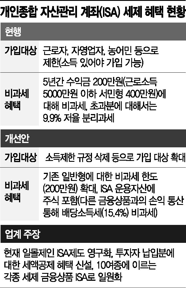 [아시아경제 박지환 기자] 올해부터 개인종합자산관리계좌(ISA)의 가입 조건이 크게 완화됐다. 만기가 기존 5년에서 3년으로 단축되고, 가입자격도 기존 소득이 있는 자에서 만 19세 이상으로 문턱이 낮아졌다. 오는 25일부터는 투자중개형 ISA를 통해 일반 개별 주식 매매도 가능해지면서 주식 투자와 세금 혜택을 동시에 노리는 투자자들의 참여가 얼마나 증가할지 관심이 쏠린다.
