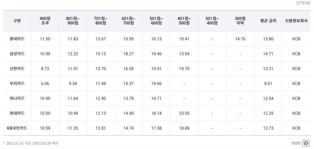 이에 따라 올 1월부터 신용카드 발급기준이 기존 6등급 이상에서 나이스평가정보 신용점수 680점 이상 또는 코리아크레딧뷰로(KCB) 576점 이상으로 변경됐는데요. 여신금융협회는 최근 신용평가사 신용점수를 기준으로 지난달 카드론(장기카드대출) 금리를 공개했습니다.