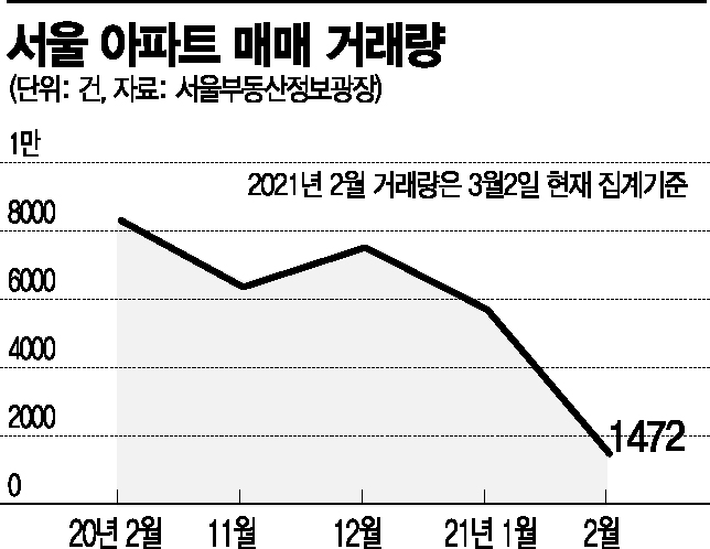 다만 2·4대책 이후 거래량은 급감하고 있어 향후 부동산 시장 상황을 쉽게 가늠하기 힘들다는 분석도 나온다. 서울부동산정보광장 집계를 보면 2월 아파트 매매 거래량은 1472건으로 전월 5690건 대비 74% 급감했다.