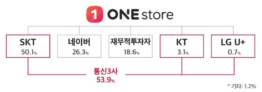 3일 통신3사와 원스토어에 따르면 KT·LG유플러스는 최근 원스토어에 총 260억원을 투자하고 3.8%의 지분을 확보했다. KT가 210억원(지분율 3.1%), LG유플러스가 50억원(0.7%) 규모다. 이에 원스토어의 지분구조는 통신3사(53.9%), 네이버(26.3%), 재무적투자자(18.6%) 등으로 재편됐다. 기존 지분구조는 SK텔레콤(52.1%), 네이버(27.4%), 재무적투자자(19.4%) 등이었다.
