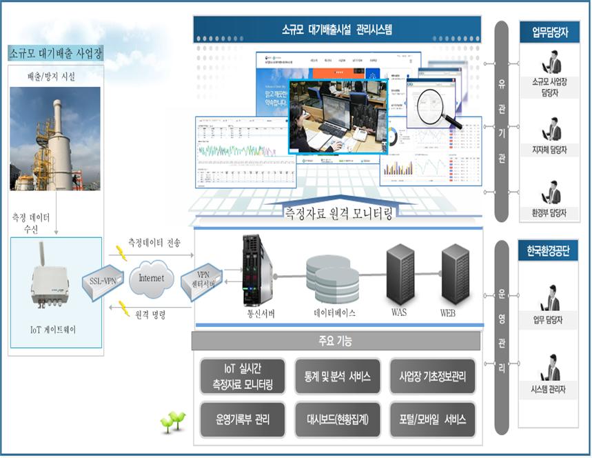 IoT 측정기기는 시설 특성에 따라 전류·압력·pH·온도계 등 4개 종류로 구분된다. 사업장의 배출시설과 방지시설 IoT 측정기기에서 측정된 가동정보(상태정보)는 5분 간격으로 IoT 관리시스템로 전송된다. 이를 통해 관리기관은 관할 사업장의 상황을 모니터링할 수 있고, 사업장은 방지시설상태 확인과 소모품 교체주기 파악 및 방지시설 가동정보 등 통계를 활용해 자율적인 환경관리 역량을 높일 수 있다.