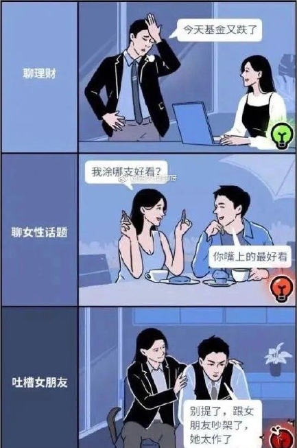 이성 동료 간에 재테크와 관련한 대화(초록색 불)는 나눠도 되지만, 립스틱과 관련한 대화(주황색 불)는 위험하며 여자친구와 다툰 이야기를 나누는 것은(빨간색 불) 안 된다고 소개돼있다.