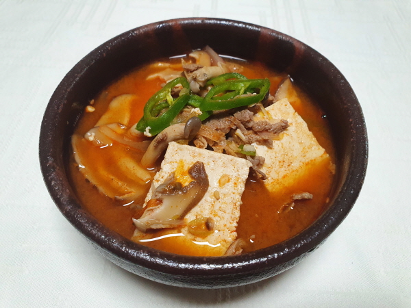 속뜨물에 고추장을 풀어 두부를 주로 하여 소고기와 버섯을 넣고 국간장으로 간을 맞춘 찌개이다. 소화가 잘 되고 감칠맛이 있는 새우젓을 넣은 맑은 두부찌개도 맛이 있지만 고추장을 넣은 얼큰한 두부찌개는 부드러운 두부와 어울려 맛을 매력적인 맛을 낸다.