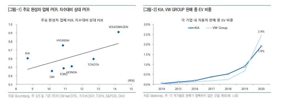 올해 글로벌 자동차 판매는 전년대비 9.4% 증가할 것으로 추정된다. 기아 판매는 12.5% 늘어나며 시장점유율이 확대될 것으로 전망된다. 기아도 역시 현대차와 마찬가지로 전기차(EV) 시장에 중점을 두고 있다. 그룹 내에선 현대차의 아이오닉5에 이어 두 번째로 전기차 전용 플랫폼(E-GMP) 기반 전기차인 'EV6'를 이달 공개할 예정이다. 기아의 지난해 전기차(EV+PHV)와 EV 글로벌 점유율은 각각 2.5%, 2.4%로 전년대비 0.4%p, 0.8%p 상승한 것으로 파악됐는데, 국가에 따라 분류가 명확하지 않은 모델을 제외하면 실제 점유율은 더욱 높을 것으로 추정된다.