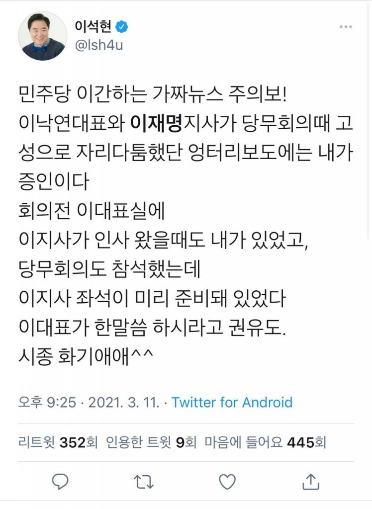 조영민 민주당 경기도 중앙협력본부장에 이어 이석현 전 국회부의장(민주당)은 11일 밤 페이스북을 통해 '민주당 이간하는 가짜뉴스 주의보'라는 글을 통해 "이낙연 (민주당)대표와 이재명 (경기도)지사가 당무회의 때 고성으로 자리다툼했단 엉터리 보도에는 내가 증인"이라며 정면 반박했다.