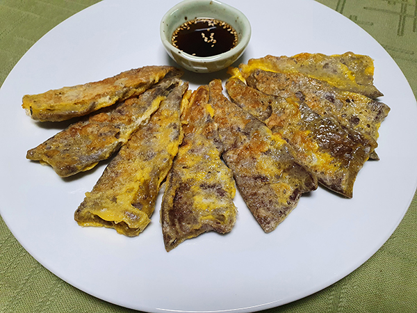 6. 밀가루를 묻히고 달걀을 씌워 식용유를 두른 팬에 놓아 양면을 노릇하게 부친다.