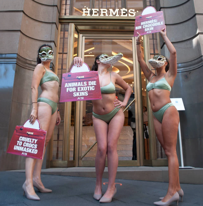 시위하는 세 여성은 초록색 비키니를 입고 악어 가면을 쓴 채 '악어를 향한 잔인성이 정체를 드러냈다', '화려한 가죽을 위해 동물이 죽어간다', 테러조직 지도자의 이름을 이용해 중의적으로 표현한 '에르메스: 빈 크로커다일 스킨'이라는 문구가 적힌 푯말을 들고 있다.