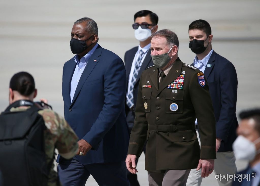 조 바이든 행정부 출범 후 첫 해외 순방에 나선 로이드 오스틴 국방장관이 17일 오후 경기 오산 미 공군기지를 통해 도착해 로버트 에이브럼스 한미연합사령관 겸 주한미군사령관과 대화하며 이동하고 있다. <br /> 로이드 오스틴 국방장관은 이날 오후 한미 국방장관 회담을 시작으로 토니 블링컨 국무장관과 18일 까지 1박2일 일정을 이어간다.17일 오전 충남 천안시 서북구 실내테니스장에 마련된 예방접종센터에서 실시된 지역 예방접종센터 모의훈련에서 접종대상자들이 관찰실에서 예방접종 후 안내문을 읽고 있다./사진공동취재단