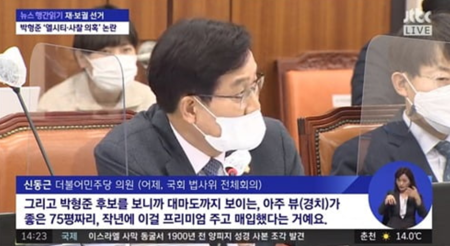 앞서 신동근 더불어민주당 의원은 지난16일 국회 법제사법위원회에서 "박형준 후보 보니까 대마도까지 보이는, 아주 뷰가 좋은 75평짜리, 당시 분양가 20억5000만원짜리를 아래 위로 가지고 있더라"라고 말했다.