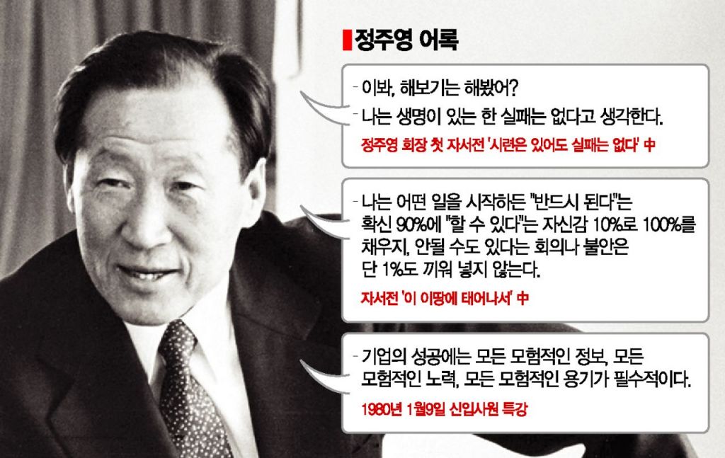[아시아경제 이창환 기자, 이기민 기자] "이봐, 해봤어?" 아산(峨山) 정주영 현대 창업주가 살아생전 강조하던 유명한 말이다. 그는 새로운 도전을 앞두고 주춤거리는 임직원에게 해보지도 않고 미리 안 된다고 생각하지 말라며 불호령을 내리곤 했다.