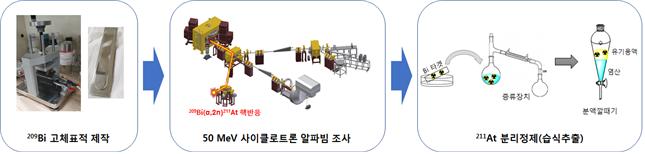 연구팀은 한국원자력의학원이 보유한 의료용 사이클로트론(MC50)을 이용해 알파빔을 표적 물질인 비스무스-209(Bi-209) 원소에 쏘아 핵반응으로 얻은 아스타틴-211(At-211)을 분리 정제 과정을 거쳐 비임상 연구를 수행할 수 있는 양 수준의 생산 기술을 확보했다.