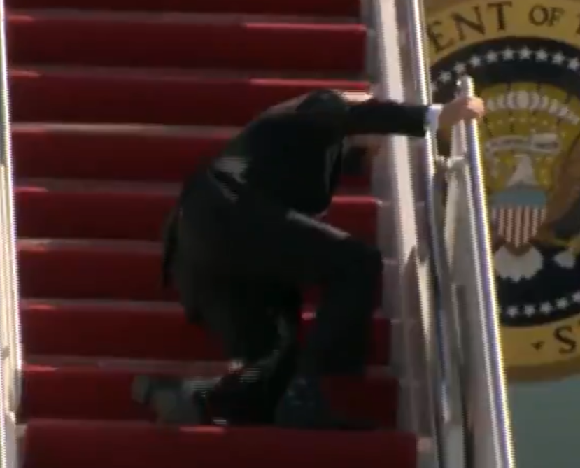 바이든 대통령은 계단에 오르기 시작할 때는 한 손으로만 난간을 잡았지만 넘어진 후에는 양손으로 난간을 잡고 이동했다.