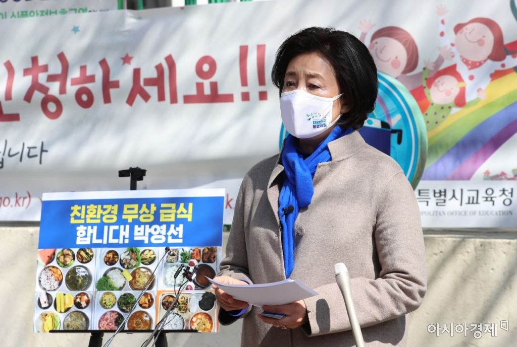 박영선 더불어민주당 서울시장 후보가 22일 서울 성동구 뚝섬로 경수초등학교 앞에서 `엄마의 마음으로 친환경 무상급식 합니다' 정책공약 발표를 하고 있다./국회사진기자단