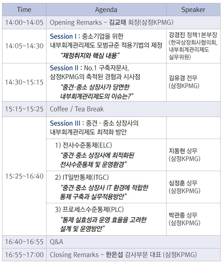 지동현 삼정KPMG 상무가 중견·중소 상장사에 최적화된 전사수준통제 및 운영환경에 대해 소개하고, 심정훈 삼정KPMG 상무는 중견·중소 상장사 IT 환경에 적합한 통제 구축과 실무적용 방안에 대해 제언한다. 마지막으로 통제 실효성과 운영 효율을 고려한 내부회계관리제도 설계 및 운영방안을 박관종 삼정KPMG 상무가 발표할 예정이다.
