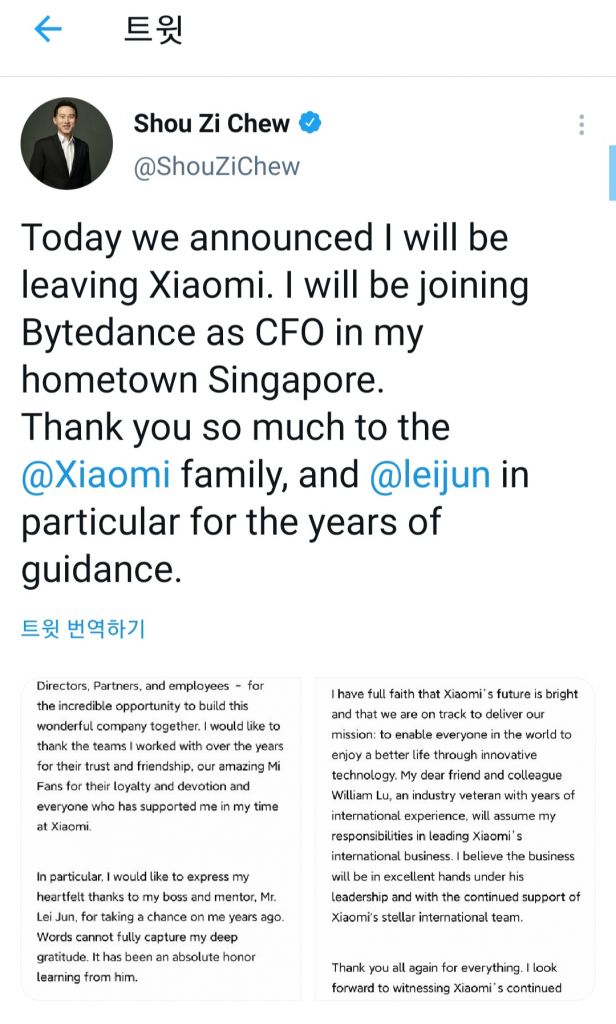 쇼우 지 츄 국제회장은 지난 24일(한국시간) 오후 7시경 개인 트위터를 통해 "오늘 샤오미는 제가 회사를 떠난다고 발표했다"며 이 같은 소식을 직접 알렸다. 샤오미는 전날 오전 그의 사임안을 제출했다.