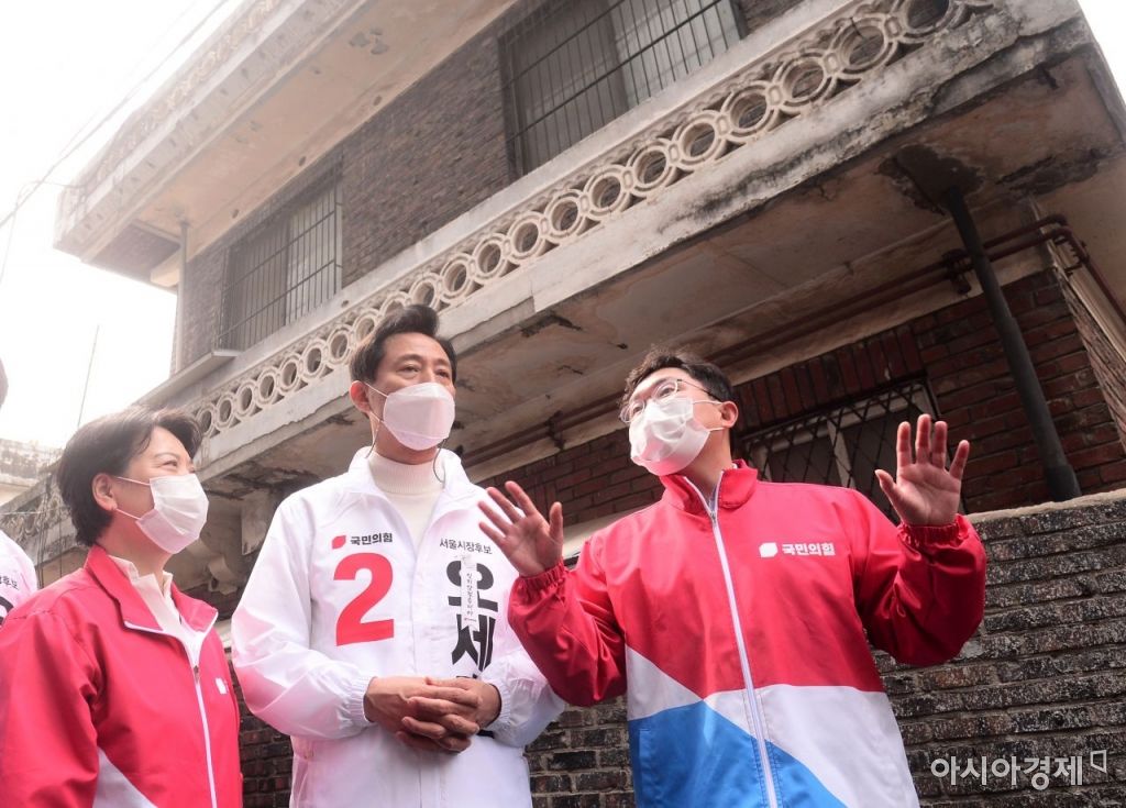 국민의힘 오세훈 서울시장 후보가 26일 서울 구로구 가리봉동 도시재생사업현장을 둘러보고 있다./국회사진기자단