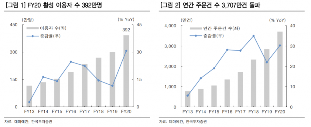 온라인 음식 배달의 침투율은 지난해 5월 기준 싱가포르 41%, 홍콩 36.7%에 달하고 있지만, 일본은 16.6%로 저조한 상황이다. 일본은 도시락과 편의점 문화가 보편화됐기 때문이다. 다만 코로나19로 인한 긴급사태 선언과 소비세율 인상으로 비율 음식 시장의 구조적 성장은 이뤄지고 있다. 긴급사태로 음식점의 영업시간 단축과 외부활동 제한이 지속되며 이용자 수가 크게 증가했기 때문이다.