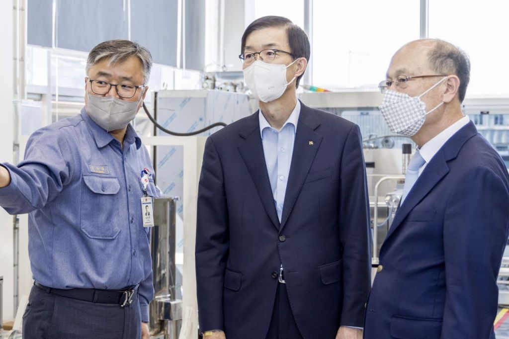 방문규 수출입은행장이 26일 오후 전남 여수에 있는 2차전지 소재 생산기업 재원산업을 찾아 연구시설과 생산설비를 견학한 뒤 회사 관계자의 설명을 듣고 있다. 사진 왼쪽부터 심성원 재원산업 대표이사, 방문규 수출입은행장, 이용규 여수 상공회의소 회장.