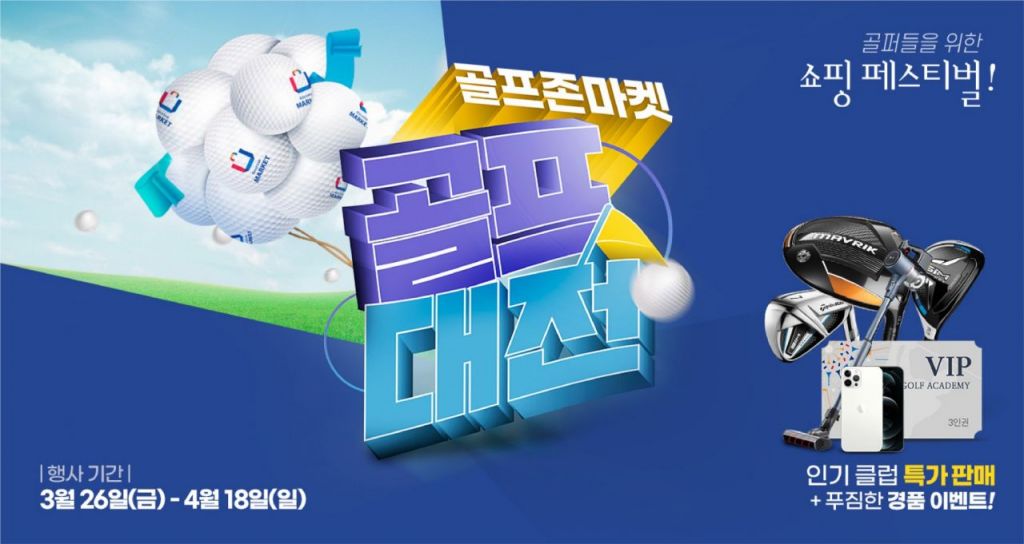 골프용품 전문매장 골프존마켓이 다음달 18일까지 골프대전(사진) 이벤트를 진행한다. 클럽과 골프백, 골프화, 거리측정기, 골프공 등 다양한 브랜드의 제품들을 실속 있는 가격으로 구입할 수 있는 기회다. 마루망 골드Ⅳ 시리즈, 캘러웨이 매버릭 시리즈, 미즈노 JPX S10 아이언, 클리브랜드 MY RTX 집코어 웨지 등을 단독 판매하고, 테일러메이드 SIM 맥스 시리즈는 특가에 살 수 있다.