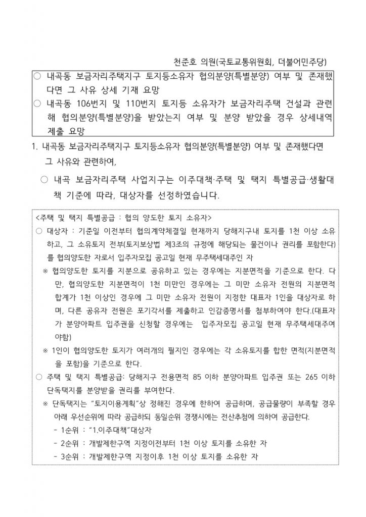 SH는 오 후보의 처가인 해당 내곡동 토지 소유자가 보금자리주택 건설과 관련해 협의분양을 받았는지 여부 ·분양 내역 등에 대한 천 의원의 자료 요구에 "기준에 따라 단독택지를 분양받을 권리(협의 양도한 토지 소유자)를 부여했고, 감정평가 금액으로 매매계약을 체결했다"고 답변했다.