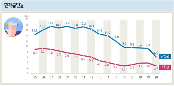 조사 결과 지난해 기준 청소년의 흡연·음주 등 건강 행태는 2019년에 비해 전반적으로 개선된 것으로 나타났다. 최근 30일 동안 1일 이상 흡연한 비율인 '현재흡연율'은 남학생의 경우 9.3%에서 6.0%로, 여학생은 3.8%에서 2.7%로 줄었다. 전자담배 역시 현재사용률이 남학생 4.7%에서 2.7%, 여학생 1.5%에서 1.1%로 감소세를 나타냈다.