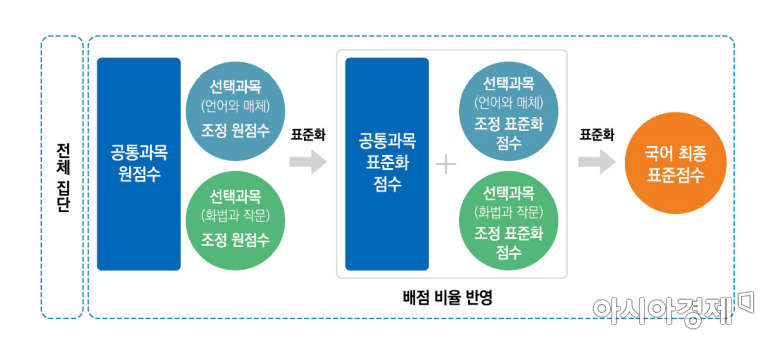 국어와 수학 성적은 등급과 백분위를 포함하는 표준점수로 표기된다. 원점수로 표기할 경우 어떤 선택과목을 골랐느냐에 따라 당락이 좌우될 수 있어서다. 표준점수는 개인이 얻은 원점수가 어느 위치에 해당하는지를 나타내는 점수다. 표준점수는 공통과목 성적을 기준으로 산출되며, 과거 수능에서도 적용했던 방법이다. 공통과목과 선택과목의 배점비율 반영을 합산해서 표준점수가 산출된다. 국어와 수학 표준점수는 0~200점이다.