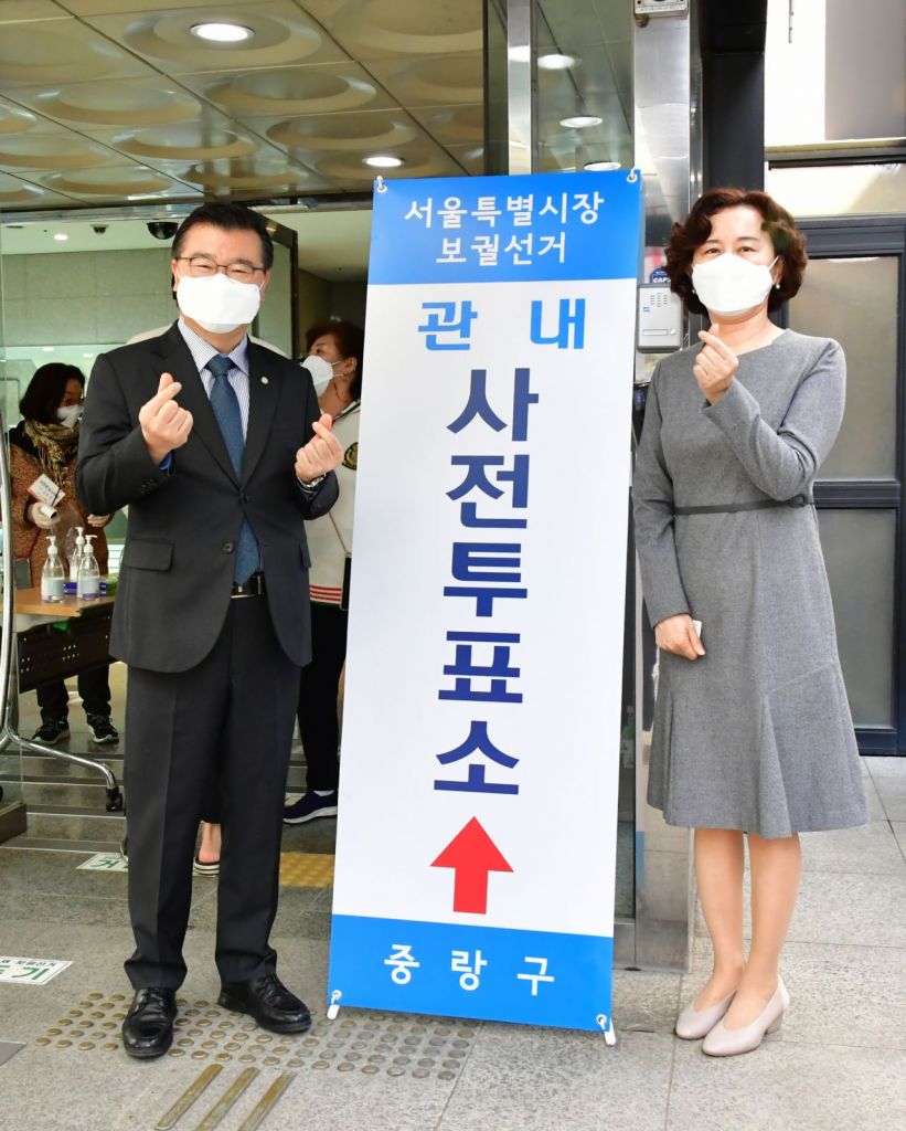류경기 중랑구청장(왼쪽)과 부인 강영숙 여사가 2일 오전 중랑구청 내 설치한 사전투표소에서 4·7 재보궐선거 사전투표에 참여했다.