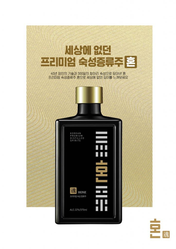 '혼'은 골든블루가 지역특산주 업체와 협업해 선보인 프리미엄 숙성 증류주다. 경북 문경산 사과를 원료로 활용해 다른 증류주와 맛을 차별화했으며, 고급 위스키와 동일한 증류 방식 및 300일간 전통 항아리 숙성 방법을 적용했다.