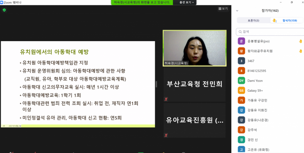 부산교육청이 줌을 통해 진행 중인 ‘유치원 아동학대예방교육’ 모습.