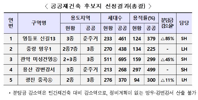 국토부는 "후보지들은 주로 민간 정비사업으로는 사업성이 부족하거나, 주민 간 갈등으로 사업이 장기간 정체된 곳"이라며 "공공의 참여, 지원 하에 사업성을 제고하게 될 경우 속도감 있게 도심 내 주택을 공급할 수 있을 전망"이라고 설명했다.