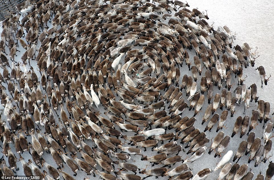 지난 4일 타임즈나우 등에 따르면, 사진작가 레프 페도세예프는 지난달 24일(현지시각) 러시아 무르만스크주(州) 로보제로 마을 외곽의 한 농장에서 순록 떼가 소용돌이처럼 원을 그리며 회전하는 모습을 드론을 띄워 촬영했다.