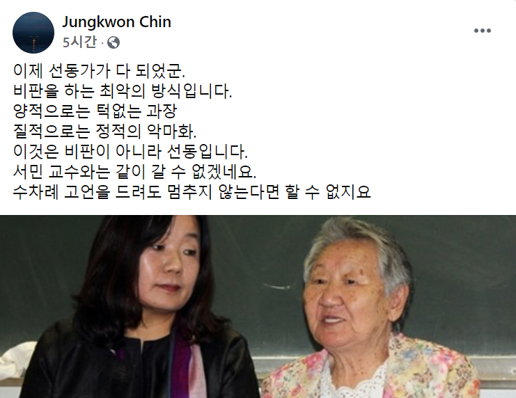 진 전 교수는 이날 페이스북에 서 교수가 윤미향 더불어민주당 의원을 '잔인한 악마'라고 비판했다는 내용의 기사를 공유하며 "비판을 하는 최악의 방식이다. 이것은 비판이 아니라 선동"이라고 지적했다.