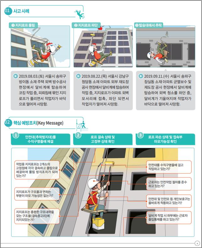 고용부는 이날부터 3주간 달비계를 쓰는 건물 외벽 작업 현장을 최우선으로 긴급 패트롤 현장점검, 감독을 하기로 했다. 대한주택관리사협회 등 유관기관과 협조해 달비계 사용현장을 파악한다. 이후 달비계 현장 근로자를 대상으로 '달비계 작업 3대 핵심 예방조치'를 집중 지도할 계획이다. 3대 조치는 ▲수직 구명줄 설치 ▲작업용 로프결속 및 고정부 상태 확인 ▲로프 파손 및 접속부 마모가능성 확인 등이다.
