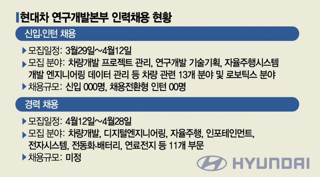 현대차는 지난해 12월 ‘CEO 인베스터 데이’에서 2025년까지 미래 사업 역량 확보를 위해 23조5000억원을 투자하겠다고 밝힌 바 있다. 구체적인 부문별 투자 금액은 전동화 10조8000억원, 수소사업 4조1000억원, 자율주행 1조6000억원, 모빌리티서비스·플랫폼 1조2000억원, 커넥티비티 1조원, 도심항공교통(UAM)·로보틱스·인공지능(AI)에 4조8000억원 등이다. 현대차는 계획대로 미래 모빌리티 원천기술 확보를 위한 R&D, 국내외 시설투자 뿐만 아니라 미래 모빌리티 산업 생태계도 조성하고 있다. 현대차 관계자는 "이번 대규모 신입 채용은 현대자동차의 미래의 새로운 장을 이끌어갈 핵심 인재 확보를 통해 미래 모빌리티 산업에서의 주도권을 강화하기 위한 것"이라며 "앞으로도 R&D 부문 우수 인재 확보에 적극적으로 나설 계획"이라고 말했다.