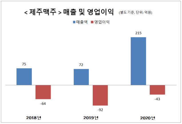 제주맥주의 외형이 급격하게 성장하면서 지난해 매출액(215억원)도 전년(72억원) 대비 199% 늘어났다. 하지만 제주맥주는 아직 적자 상태를 벗어나지 못하고 4년 연속 영업손실을 기록 중이다.