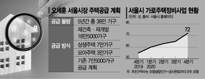 이번 현장은 재건축·재개발이 아닌 오 시장의 또 다른 주택공급 공약인 모아주택과 관련한 것이다. 앞서 오 시장은 소규모 필지 소유자끼리 공동 개발할 수 있도록 일정규모 이상이면 용적률 인센티브를 부여하는 모아주택으로 3만가구를 공급하겠다고 약속한 바 있다. 가로주택이나 모아주택과 같은 소규모 재건축은 대규모 재건축과 달리 사업 절차가 간소화돼 있어 신속하게 사업을 추진할 수 있는 장점이 있다. 하지만 공급 규모가 적고 도로를 비롯한 주변 인프라 개선이 불가한 단점이 있어 일반 시민이 원하는 주택과는 괴리가 크다.