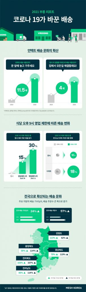 메쉬코리아가 지난해 배송 데이터를 기반으로 분석한 결과, 코로나19로 인해 국내 소비자들의 배송 트렌드가 크게 변화하는 양상을 보였다. 리포트에 따르면 문 앞에 놓아달라는 비대면(언택트) 배송과 19시 이후 저녁 시간 배송이 증가했으며 헬스, 뷰티, 의류 등 배송 카테고리가 다각화됐다. 2020년 전체 주문 건수 및 라이더 수도 큰 폭으로 증가한 것으로 나타났다.
