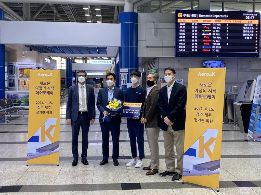 강병호 에어로케이 대표(왼쪽에서 두번째)가 15일 임직원들과 함게 ‘청주~제주’ 노선 정기편 첫 취항을 축하하며 승객과 기념촬영을 하고 있다.