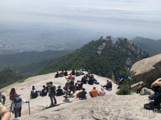 북한산 백운대 정상에 오른 등산객들이 쉬고 있다. 사진=아시아경제DB