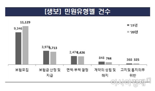 생명보험 민원발생 건수는 2만1170건으로 전년대비 4.1% 증가했다. 보험모집(52.6%) 관련 민원이 가장 많았고 보험금 산정 및 지급(17.5%), 면부책 결정(11.5%)도 높은 비중을 차지했다.