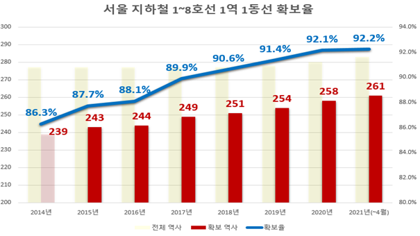 아울러 엘리베이터 확대를 통해 ‘1역 1동선’을 확보한다. 공사는 올해는 6호선 상수역과 3호선 충무로역, 두 곳에 승강시설을 설치할 계획이다. 공사는 지난 2015년 서울시의 ‘장애인 이동권 선언’에 발맞춰 지속적으로 노력한 끝에 지하철 승강시설 확보율을 87.7%(277개 역사 중 240개)에서 올해 4월 기준 92.2%(283개 역사 중 261개)까지 끌어올렸다.