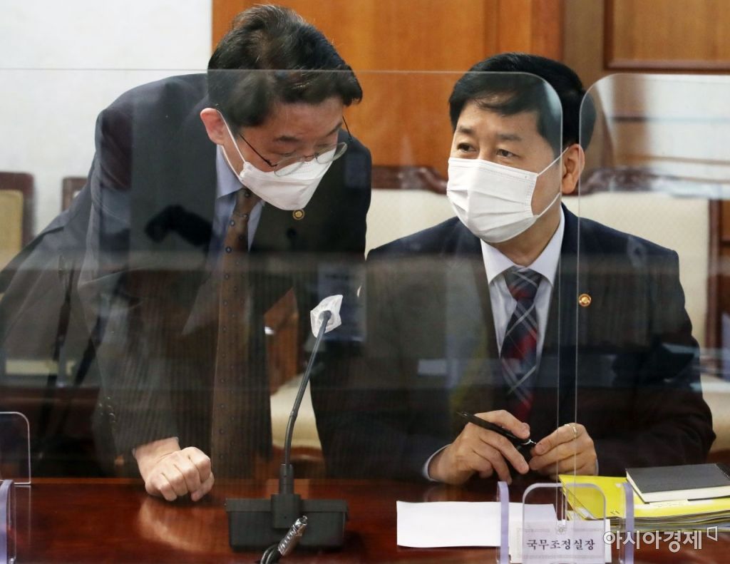 구윤철 국무조정실장과 이억원 기재부1차관이 19일 오전 서울 종로구 정부서울청사에서 열린 부동산 투기의혹 수사협력 관련회의에서 대화를 하고 있다./김현민 기자 kimhyun81@
