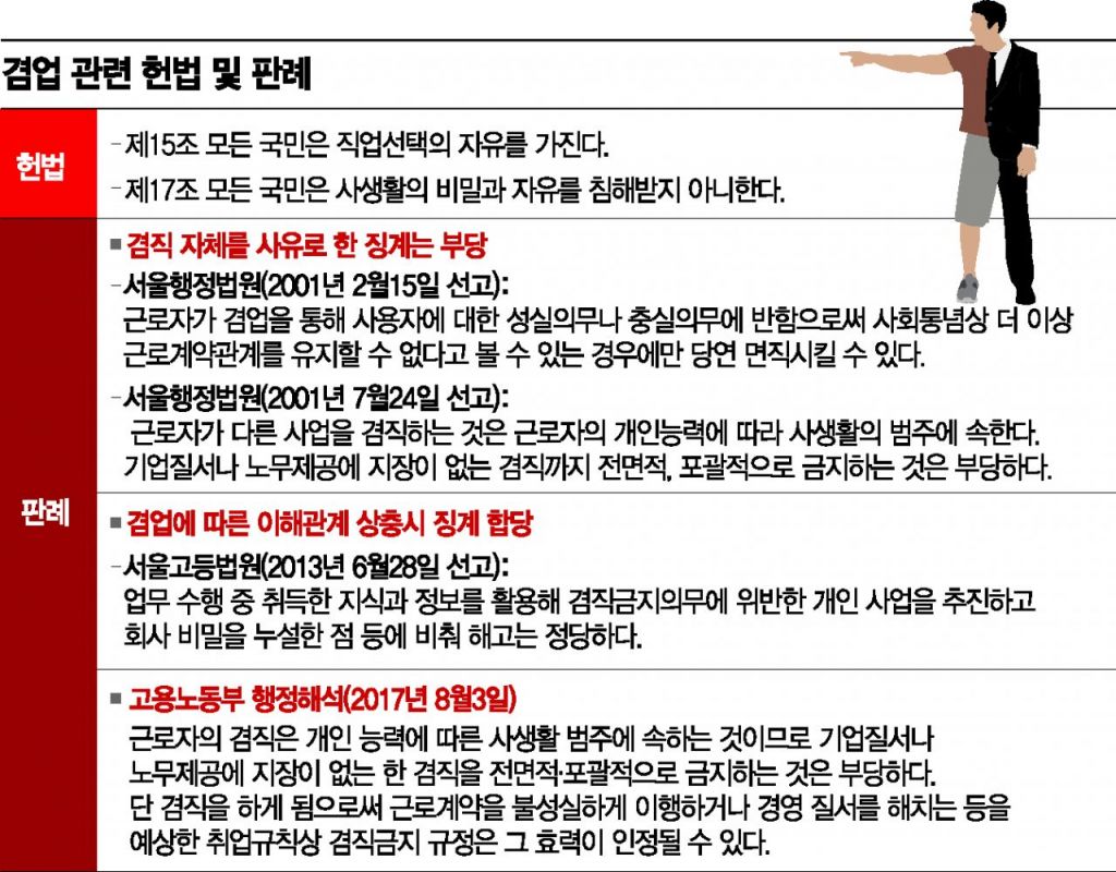 고용노동부도 2017년 행정해석을 통해 겸직 자체에 대한 징계는 부당하다고 판단하고 있다. ‘사생활 범주에 속하는 근무시간 외에 기업질서나 노무제공에 지장이 없는 한 겸직까지 전면적·포괄적으로 금지하는 것은 부당하다’는 것이다.