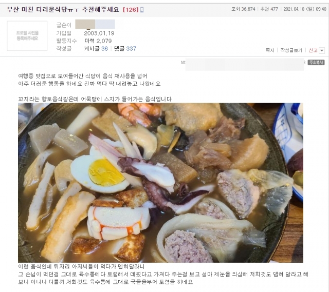 글쓴이는 "부산 중구 한 식당이 음식을 재활용한다"라며 "뒷자리 아저씨들이 먹다가 재가열 해달라고 했더니, 그 손님이 먹던 걸 그대로 육수통에다 토렴해서 데워서 가져다 주는 것을 봤다"라고 주장했다.